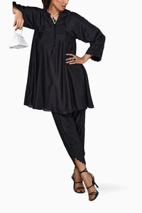 Step into timeless elegance with Cliantha Black Silk Flared Short Kurta and Tulip Pants set. Made from luxurious silk fabric, this 2-piece ensemble features a flared kurta and matching tulip pants, all in a classic black hue.