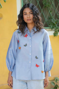 Featuring Cloud Blue Flutter Shirt from URAIB's collection Summer Lovin'. The product is made from 100% cotton chanderi highlighing the pretty butterflies sprayed out unevenly along with pleat detailed sleeves.