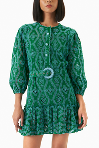 The short Clover dress is cra fted in a contra st broderie a ngla ise . This color combina tion of green a nd light blue ha s a lwa ys been our fa vorite. The dress ma de in pure cotton , ha s a stra ight fit with a deta cha ble belt. The clover dress is highlighted with stunning ha nd-ma de bea ded buttons a nd belt.