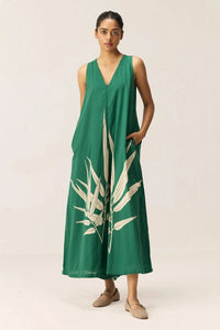 Featuring a classic Khara Kapas silhouette in a rich green hue, this handcrafted cotton mul jumpsuit showcases a striking white fern print on the front. Designed with a front zipper, relaxed fit, and clean structure, it effortlessly blends comfort with style. Fully lined and equipped with pockets, it’s a versatile piece perfect for day-to-evening wear.