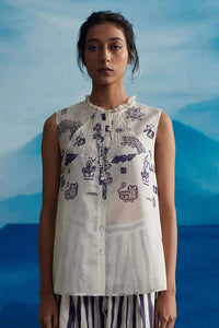 An artfully crafted and hand-screen printed top that boasts a front placket and a unique raglan yoke. Infused with intricate pin tuck detailing and adorned with delicate lace around the neckline, this versatile piece is a harmonious blend of charm and sophistication. Its adaptability makes it the perfect choice to elevate any outfit, establishing itself as a refined and stylish wardrobe essential that effortlessly combines elegance with everyday flair.