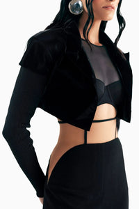 The Coal Cropped Jacket with “Humans of Essé” embroidery, made from foil-coated taffeta and ribbed fabric in black, blends contemporary style with artistic flair. Featuring bold embroidery, this cropped jacket offers a unique, edgy look that adds sophistication and personality to any outfit.