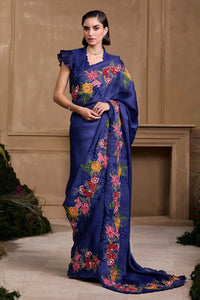 This cobalt blue silk organza saree is a stunning combination of delicate floral embroidery and contemporary design. The saree features intricate floral motifs embroidered in soft tones, adding texture and depth to the sheer organza fabric. The ruffle detail along the border enhances the modern, dynamic aesthetic, creating a playful yet elegant effect.