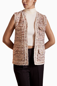 Elevate your style by layering this tweed jacket over high-waisted denim, offering a contemporary twist to classic sophistication. Embrace the fusion of old-world charm and modern flair with this chic ensemble.