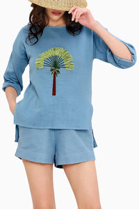 Hand embroidered soft crush cotton summer top teamed with textured shorts with a fully elasticated waist with a draw string.