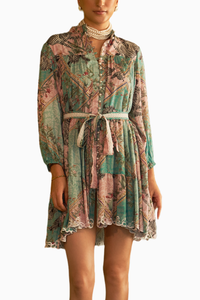 Featuring printed dress with delicate pearl placket detailing down front, cut-work embroidery hem and cinched at the waist with a lace belt.