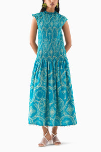 The Coconut palm Ruching Dress crafted from our 100% cotton fabrication, trans-seasonal, is a statement piece. The dress, made in our coconut palm print, is full length. With ruching all the way till the waist, this dress has cap sleeves and gathers. Featuring a summery look, it shell hangings. It has a straight casual fit. Wear it with heels for an elegant look.