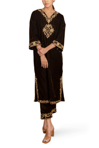 Coffee Brown Silk Velvet Embroidered Kurta Set