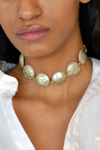 Wear it as a choker or unclip and style it as a bracelet! The Coin choker in a champagne gold with an embossed croco effect can be styled alone or even layered with dainty gold chains.