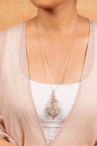 Material: 24 K Fine Gold- 1.88 gms, Natural Polkis- 1.55 CTS, Sterling Silver- 28 Gms Color: Silver and Gold Width: 2", Height: 3", Chain Length: 24" Product Code: SVEUNCUTUN07