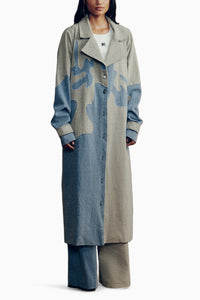 Worlds collide with this dual denim trench, combining two denim in one unique-yet-timeless piece with big peak lapels and a loose, longline shape you’ll wear year-in and year-out.