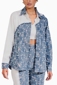 Featuring the Color Block Denim Shirt from House of Zeniaa's Rodeo Blue Collection. This season's crush boasts a front-open design, ideal for layering over a white crop top. Versatile for dramatic or chic looks, wear it alone or layered.