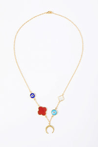 The clover is in natural mother of pearl & rust onyx along with imitation turquoise evil eye bead and glass evil eye bead.