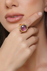 A stylish 22kt gold plated gemstone studded ring inspired by the traditional Navratna jewellery. The ring features 9 cosmic gemstones which include an Amethyst cabochon in the centre and is studded with smaller cabochons of Garnet, Mother of Pearl, Smoky Quartz, Carnelian. Green Onyx, Crystal Quartz, glass Cat's Eye and Citrine.