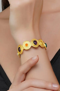 A sleek 22kt gold plated cuff bracelet studded with 9 cosmic gemstones inspired by traditional Navratna jewellery but presented in a contemporary wearable style justifying the modern day aesthetics. The bracelet includes glass Cat's Eye, Green Onyx, Crystal Quartz, Amethyst, Carnelian. Garnet, Mother of Pearl, Citrine and Smoky Quartz.