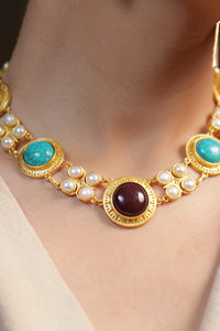 A glorious collar necklace that's got it all - gemstone cabochons which include Garnet, Turquoise and Malachite set amidst a lace of pearls. Elegant, bold and colourful, the necklace brings all the attention to your neckline. The options of styling this are plenty - pair it with a monochrome outfit, dress up a casual look or nail evening glamour with outfits of suitable neckline. Finish the look with stud earrings from the collection for a well balanced look.