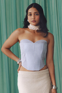 Tailored to perfection, this pinstripe corset is where structure meets softness. Cut in a classic blue-and-white pinstripe cotton, it features a sculpted sweetheart neckline that flatters the décolletage, while the boned bodice offers a supportive, cinched silhouette. The contemporary, minimalist design gives it effortless versatility whether styled solo for a statement look or layered under a blazer for elevated edge. A timeless piece reimagined for modern wardrobes.