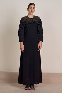 The Constellation Dress in black features an easy, relaxed kimono-inspired fit with a full-length silhouette. Its upper layered panel is adorned with delicate handmade French knots across the neckline and sleeves, adding subtle texture. A side zip closure ensures seamless, comfortable wear.