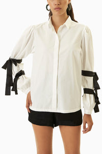 White cotton poplin shirt with matador-inspired sleeves. Black satin bow tie-up detailing on the sleeves to create shape. Concealed button placket, metal button closure at the cuff. Regular fit.