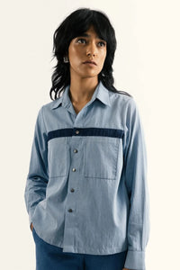 The Contrast Stripe Shirt features a regular shirt collar and bold contrast panels that add a dynamic touch to its design. It includes front patch pockets for a functional and stylish element, along with contrast topstitch detailing that enhances its visual appeal. With full sleeves and a boxy fit, this shirt offers a relaxed and modern silhouette, finished with a cropped length for a contemporary, on-trend look. Perfect for layering or pairing with high-waisted pieces for a balanced outfit.