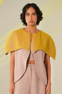 Featuring structured shoulders for a sharp, defined silhouette, this piece is enhanced by hand embroidery in electric blue and white cords on the front and inner sleeves, adding depth and dimension. Designed for versatility, it’s perfect for layering or wearing as a standalone statement piece.