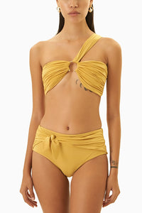 Summer-Sexy Bikini Set with a unique cut detailing in front. With an inverted round trim detailing in front & one-side shoulder strap, this piece joins a round trim at back for a sexy look. It's paired with a bow-knotted bikini bottoms. Has removable padding and minimal coverage.
