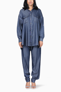 Featuring Cool Blue Willow Set by 431-88 Shweta Kapur from The Popsicle Collection. Tailored in faux denim, this relaxed fit shirt that has 3/4th sleeves with a concealed placket. Wear it with your favourite denims for a cool denim on denim look.