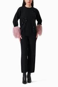 A cold weather statement in the richest colour combination- Black and blush. Trimmed with the softest shearling cuffs in blush ( which are detachable btw) , the Cooper set is not only super plush but nails the balance between comfortable and sophisticated. Lovingly made in our signature wool blend, this co-ord set is highlighted with scattered tonal - floral embellishments. This is the kind of piece that will be perfect for those sultry winter nights,thanks to its shimmering embellishment.