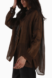 A relaxed, oversized shirt pleated and scrunched in sheer metallic silk. It comes with an inner chemise in fine cotton.
