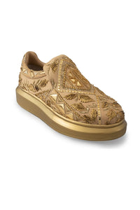 Composition- Milano Satin Colour- Gold Heel Height- Heel Measures 1" Embroidery details- Hand Made Product code - SVEANNANFS001