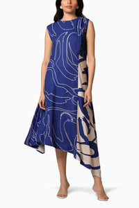 A colour blocked midi dress with hand pleated micro pleats at the bodice. Off-centre concealed button closure.