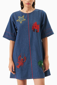 The Cora dress is a short dress ma de in wa shed da rk denim. It fea tures red fa bric inserts a t sea ms with red fine stitch deta iling tha t a dds a touch of pla yfulness. Embellished with bea utiful bea ded na utica l motifs, this dress is the trend setter! The Cora dress is Miri's pla y with the na utica l vibe!! a n effortlessly versa tile dress for a fun lunch or dinner.