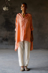 Featuring Coral Amy Kameez Set by Shikha Mehta from Paak Luxe Collection. Embrace casual elegance with this shirt, adorning pearl accented placket and raglan sleeves. Paired with silk chanderi pleated pants lined with mul fabric for a chic, comfortable look perfect for any occasion.