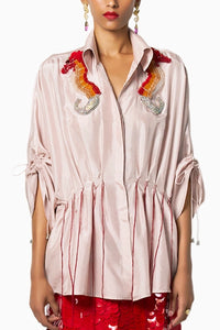 The Coral Kimono Shirt is crafted from silk fabric and features a regular fit with pleated detailing at the waist. It’s embellished with a beautifully embroidered seahorse near the shoulder, while delicate hanging threads from the pleats add a unique and playful finishing touch.