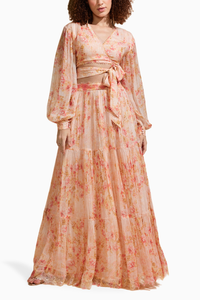 Featuring Coral Bliss Top and Skirt Set by Roseroom, a chic Knot Style Top with Skirt ensemble in vibrant Coral. Crafted from French Chiffon with printed embroidery and delicate laces, offering a standard fit for a trendy and timeless look.
