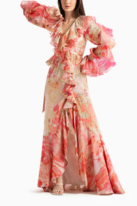 Elevate your style with our Coral Brasso Organza Dress. Showcasing casal couch brasso with frill details, this asymmetrical dress exudes elegance and sophistication for a memorable look.
