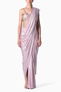 Our bestselling draped sari now in our new slinky jersey that literally feels like liquid. The Waterfall Sari is lightweight, crush free and easy to wear. All you need to do is button up the waist, throw the pallu over your shoulder and you are good to go. Pair it with our Coral Bustier which is embroidered with pink sequins and thin straps that is embroidered with sequins and beads.The blouses closes at the back with hooks.