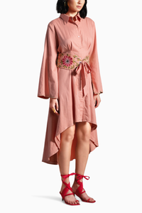 Revitalize your wardrobe with our shirt-style high-low dress, a breath of fresh air in modern fashion. The playful high-low hemline injects a contemporary twist into the classic silhouette, while the beadwork on the sleeve slits adds a subtle touch of glamour. An intricate floral embroidered broad belt cinches the waist, enhancing the dress’s elegance and providing a refined finish. A convenient front button placket completes the design, blending style with practicality for a look that's both chic and versatile.