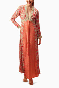 Coral gold long asymmetrical foil printed kurta with intricate hand embroidery paired with foil printed crepe pleated dhoti pants and beautiful scarf with handcrafted intricate thread tassels.