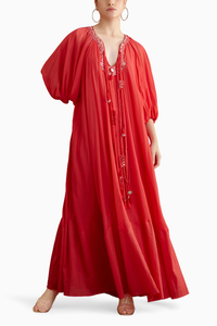 Featuring Coral Hand Embroidered Maxi Dress by Nikasha from Garden Of Eden Collection. Meticulously tailored in 100% viscose georgette with sequins and beads embroidery around the neckline and hand braided tassel detailing.