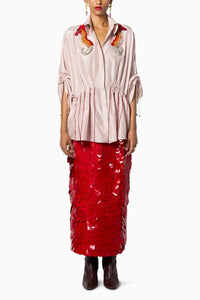 Featuring Coral Kimono With Cherry Red Skirt by 431-88's 9-6 collection, this co-ord set blends a pleated silk kimono with seahorse embroidery and a sequin-detailed pencil skirt, offering playful elegance with a chic, refined silhouette.