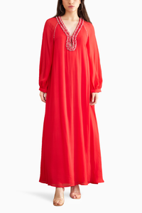 Featuring Coral Maxi Dress by Nikasha from Garden Of Eden Collection. Tailored in 100% viscose georgette with bead and crouching details on the neckline and handmade tassels detailing.