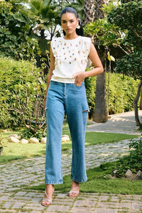 A sleeveless ivory top adorned with hand-embroidered seashells — playful, polished, and perfect for sunkissed escapes.