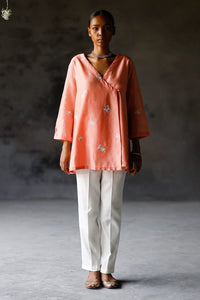 Featuring Coral Raavi Top Set by Shikha Mehta from Paak Luxe Collection. Elevate your wardrobe with this coral silk chanderi overlap top, adorning exquisite bird embroidery. Paired with elegant cotton silk cigarette pants, this ensemble offers a chic and refined look perfect for any occasion.