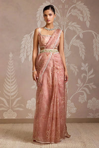 Featuring Coral Seam Embellished Saree Set by Ridhi Mehra's In the Folds Summer Collection '25. This exquisite set includes a printed organza embroidered sleeveless blouse paired with a flat saree and petticoat, complemented by a jeweled embroidered belt for a touch of glamour and refinement. A statement of timeless elegance.