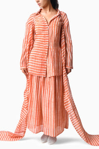 The Coral Shirt Skirt Co-ord features a playful striped button-down shirt paired with an elasticated skirt. Crafted in coral red Dabu hand-block printed Chanderi silk, printed in Bagru near Jaipur, it blends vibrant design with comfortable fit.