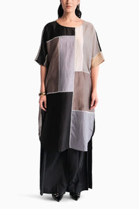 This stylish color-blocked tunic features a vibrant mix of hues, enhanced by intricate zigzag thread work that adds texture and visual appeal. Designed with convenient pockets, it seamlessly blends practicality with modern fashion, making it a versatile addition to any wardrobe.