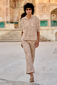 Delicate beige lace with allover tonal cord embroidery in abstract florals. Boxy lace top has dull gold fabric detailing on the collar and cuff. Band collar, cropped sleeves. Popover top with concealed hook and eye buttons. Comes with a dull gold slip. Paired with matching straight pant that has dull gold fabric detailing on the waistband and side seams. Hook/eye and zip closure in the front, pockets in the sides. Garment is fully lined.