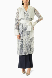 Blue and white floral printed organza trench with tailor made crepe flared pants.