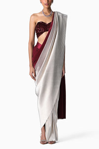 Our Midnight Sari made in our pleated metallic with an ombre foil detail is perfect for your upcoming festivities. Lightweight and easy to wear, it is pre-draped with an attached petticoat . Pair it with our Corset Bustier which is embroidered with maroon sequins in the front and black sequins at the back. The blouses closes at the back with hooks.